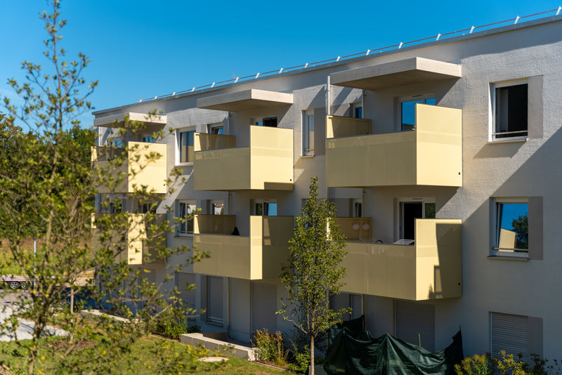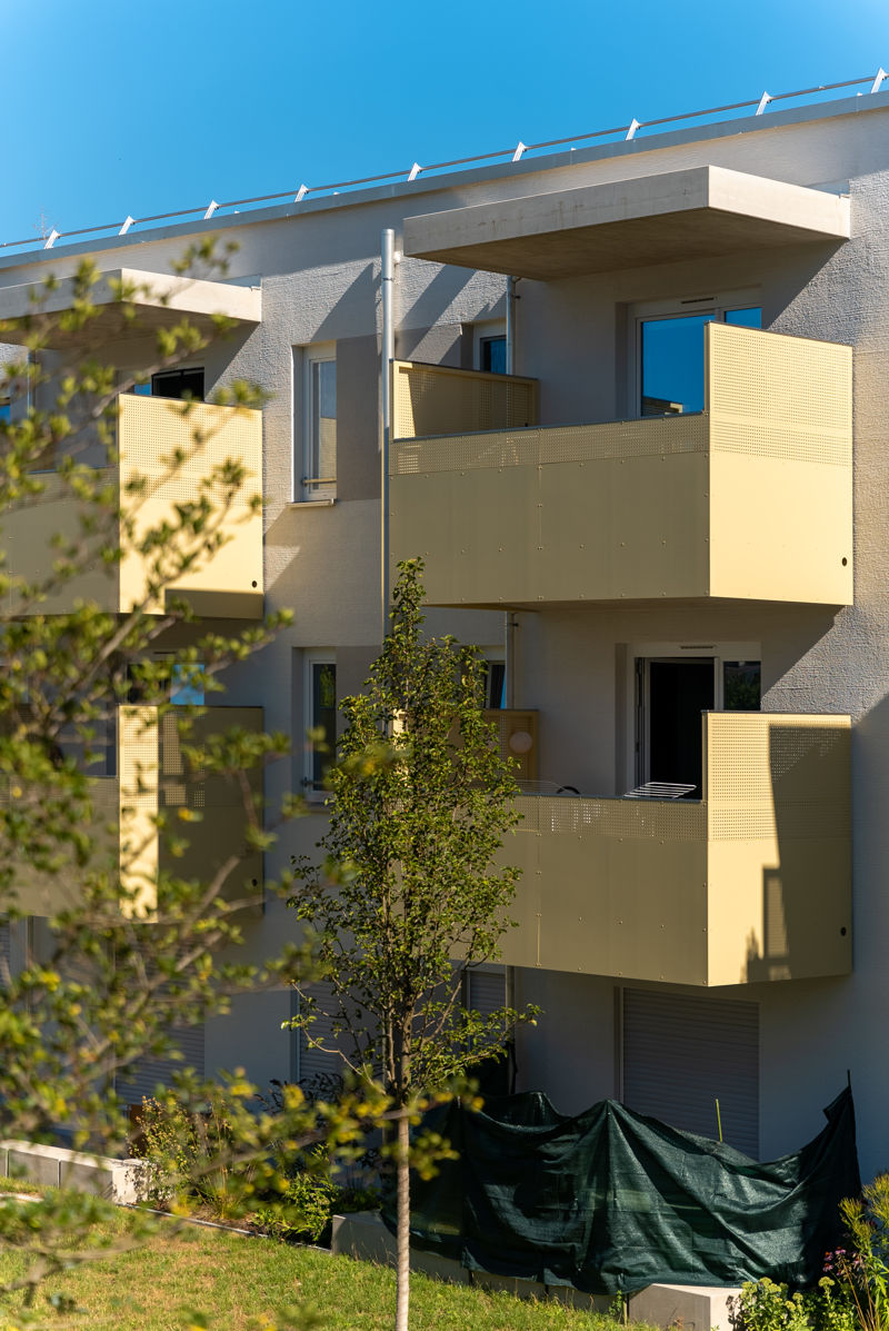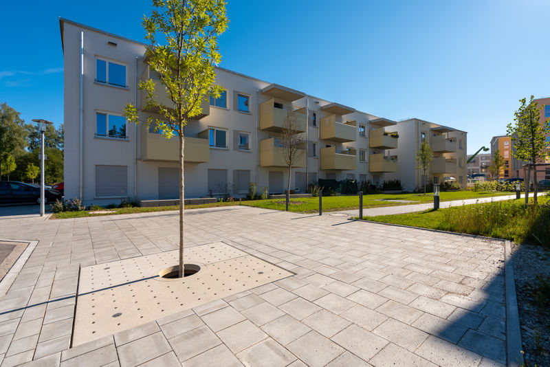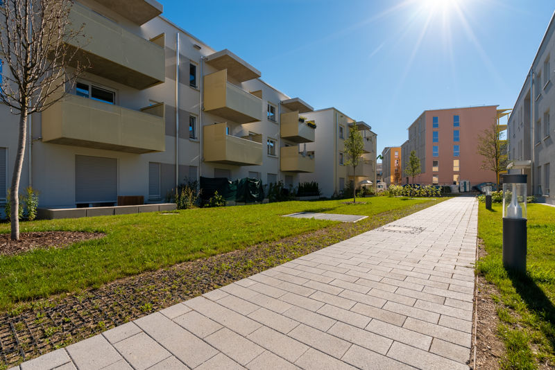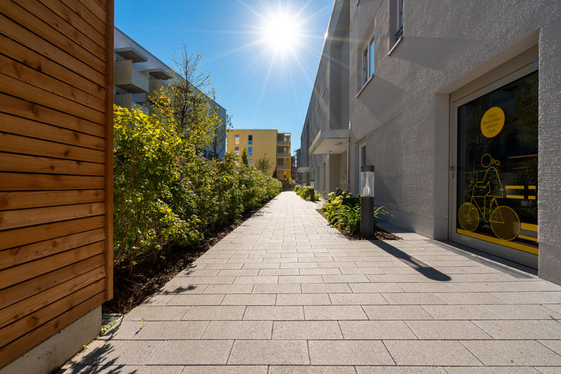Mit Ausnahme des Sonderhauses im WA 4 basieren die Gebäude auf einer ähnlichen Grundstruktur. In einer Kombination aus tragenden Stahlbeton-Halbfertigteilwänden, Hohlkörperdecken aus Fertigteilelementen und hochgedämmten, vorgefertigten Außenwänden in Holzrahmen- und Brettsperrholzbauweise entstehen wirtschaftliche, nachhaltige Gebäude mit minimierter CO2-Bilanz. Die Fassaden der Häuser sind mit einer horizontalen Wechselfalzschalung aus vorvergrautem Fichtenholz bekleidet. Die Balkone sind als vorgestellte Systemkonstruktionen mit Balkonbrüstungen mit ausreichendem Sichtschutz konstruiert.