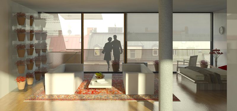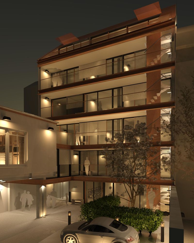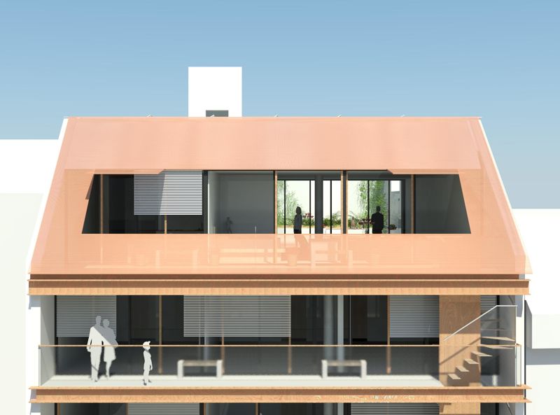 Der Neubau entstand auf engsten Grundstücksverhältnissen in einer Baulücke zwischen Altbauten der Jahrhundertwende um 1900. Im Dachgeschoss entstand eine exklusive Wohnung mit großzügig begrünter Dachterrasse und Schwimmbad.