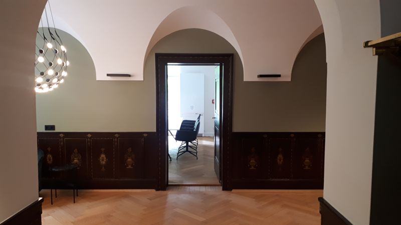 Mit Ausnahme des denkmalgeschützten Treppenhauses und des Empfangsbereichs werden sämtliche Räume nach modernsten Bürostandards ausgebaut. Zusätzlich wurde eine neue Tiefgarage mit 15 Stellplätzen angrenzend zum Altbau errichtet mit technisch aufwendigen Spezialtiefbauarbeiten.